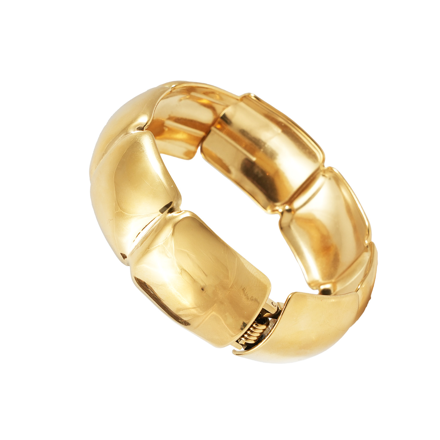 Τόσο για boho lovers όσο και για rock looks, η ιδανική επιλογή! Σταθερό, φαρδύ βραχιόλι που ανοιγοκλείνει, σε χρυσή απόχρωση. Κατασκευασμένο από χειρουργικό, ανοξείδωτο ατσάλι.