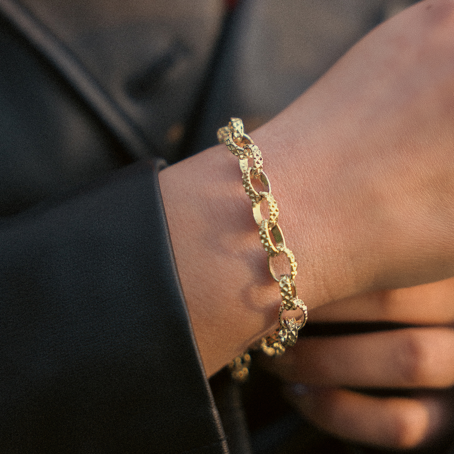 Απλό, καθημερινό και διαχρονικό! Βραχιόλι χρυσής απόχρωσης, από χοντρή αλυσίδα με γυαλιστερό φινίρισμα. Το υλικό του είναι χειρουργικό, ανοξείδωτο ατσάλι, το οποίο δε μαυρίζει και δε προκαλεί αλλεργίες.