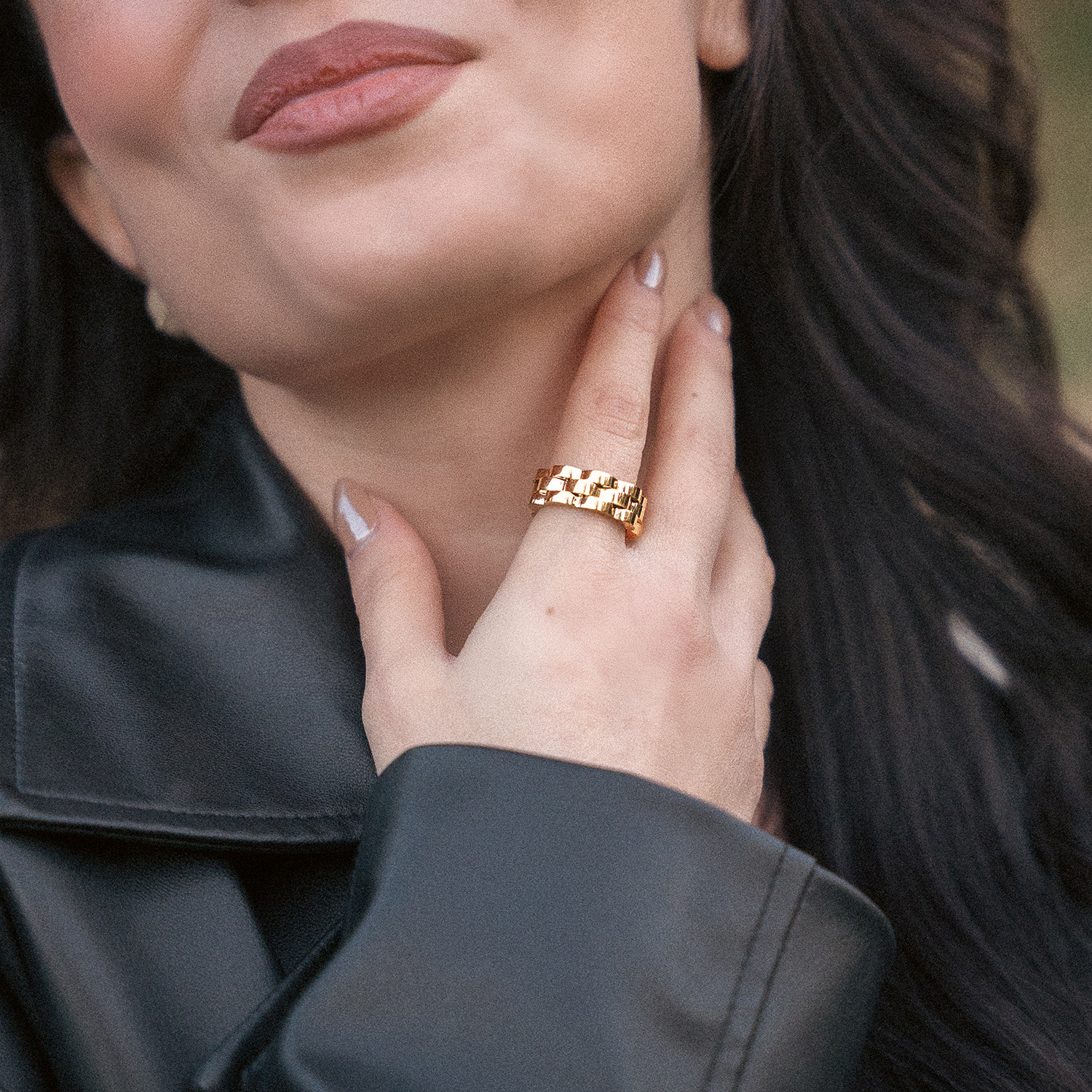 Δαχτυλίδι σε χρυσή απόχρωση, με σχέδιο μπρασελέ. Μοντέρνο και διαχρονικό, συνδυάζεται εύκολα με άλλα δαχτυλίδια καθώς επίσης μπορεί να φορεθεί και ως σεβαλιέ. Το υλικό του είναι χειρουργικό, ανοξείδωτο ατσάλι, το οποίο δε μαυρίζει και δε προκαλεί αλλεργίες.