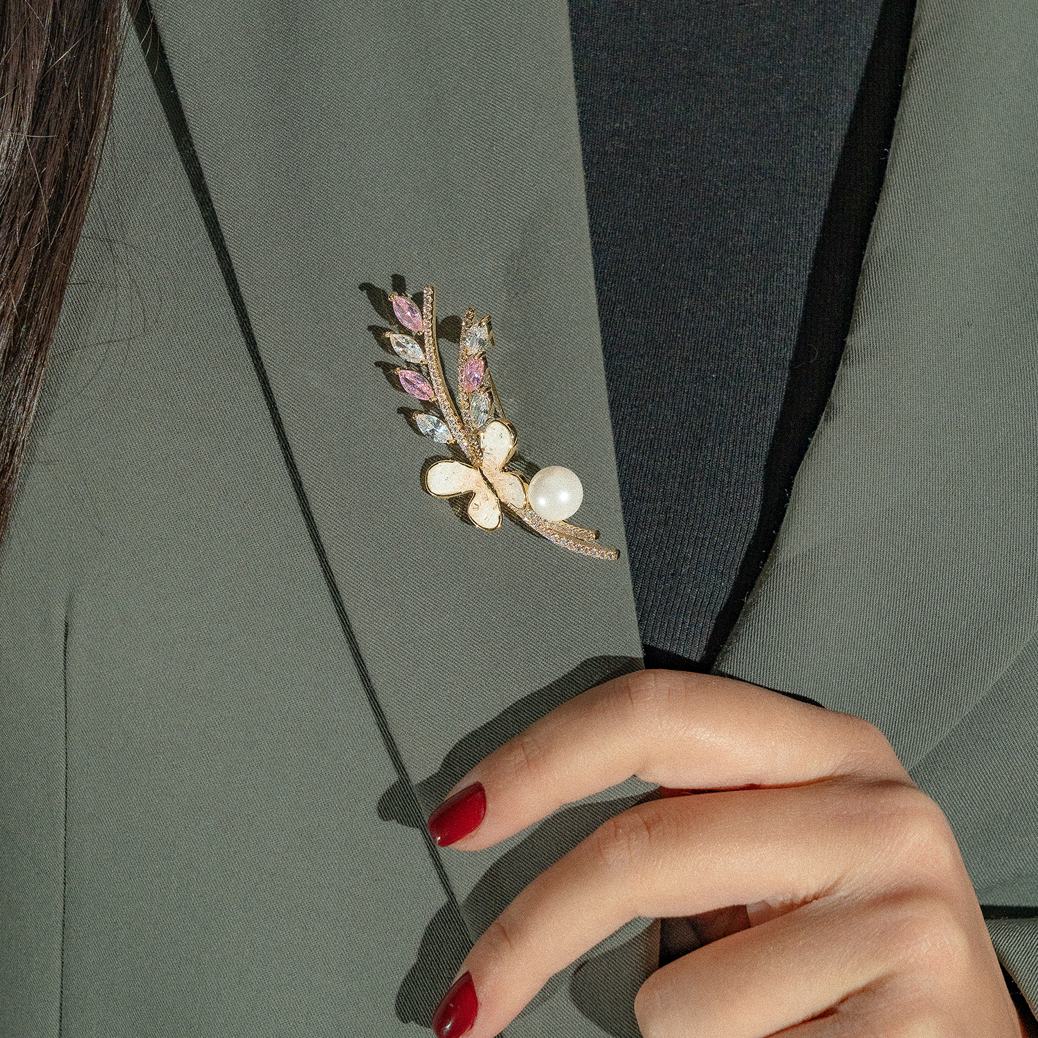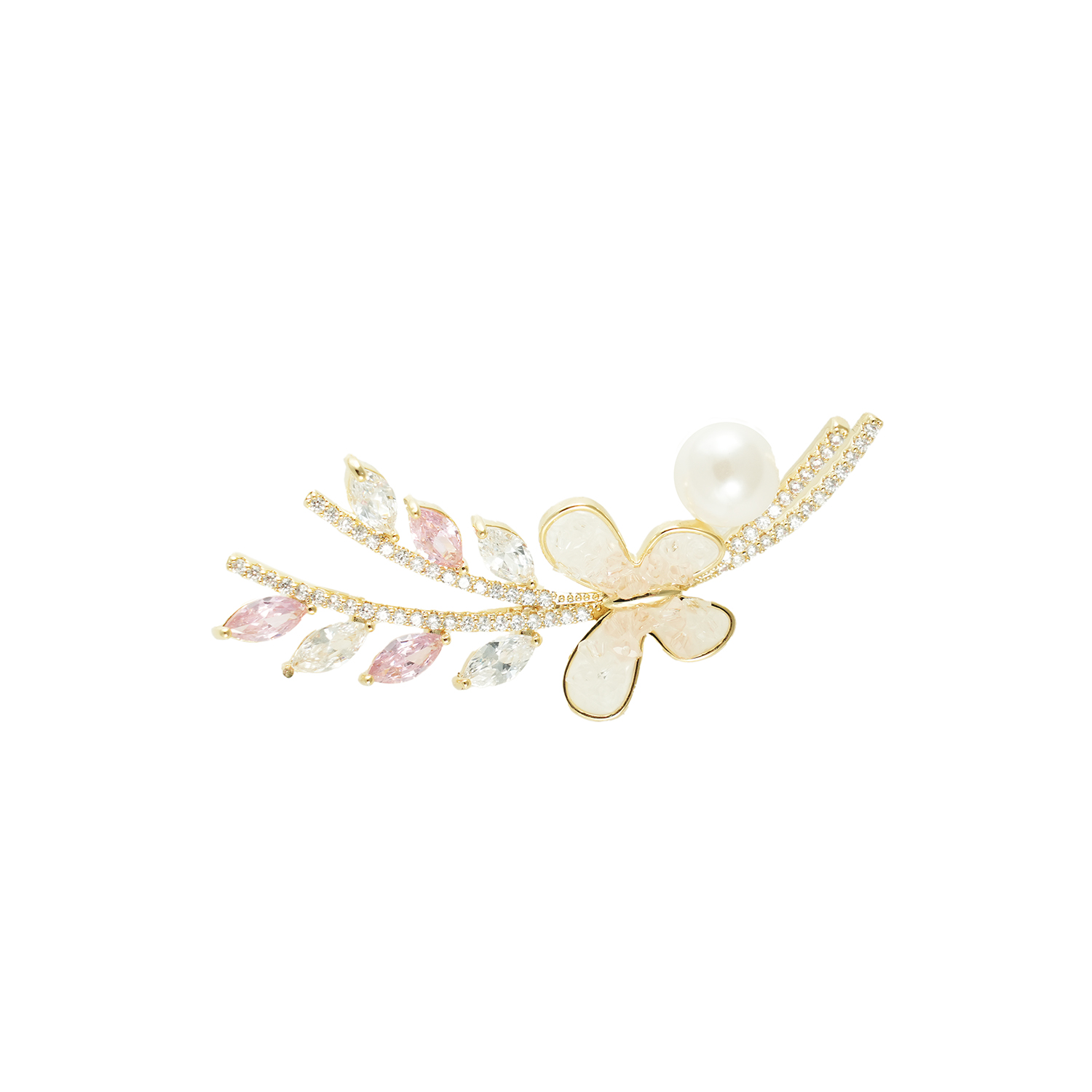 Χρυσή καρφίτσα, περίτεχνα σχεδιασμένη με κλαδί, φύλλα, πεταλούδα και πέρλα. Εντυπωσιακή και παράλληλα διακριτική, γεμάτη λαμπερές πέτρες και μοναδικές λεπτομέρειες. Ιδανική για όλες τις ώρες της ημέρας.