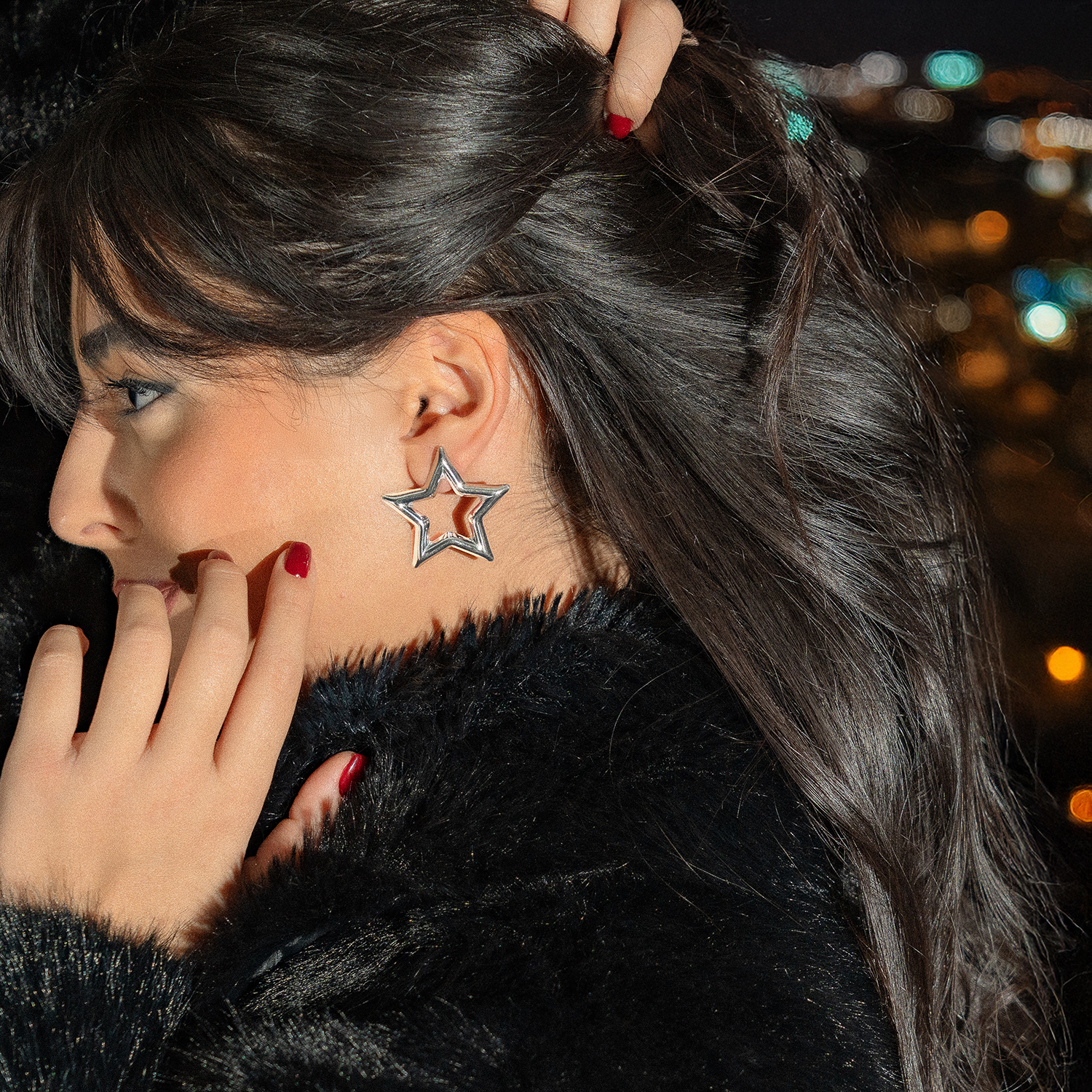 Σκουλαρίκια σε σχήμα μεγάλου αστεριού, με καρφωτή εφαρμογή και ασημένια απόχρωση. Εντυπωσιακό σχέδιο, που μπορεί να συνδυαστεί τόσο με rock looks όσο και με πιο γιορτινές περιστάσεις. Το υλικό τους είναι ορείχαλκος και διαθέτουν κούμπωμα από ασήμι 925.
