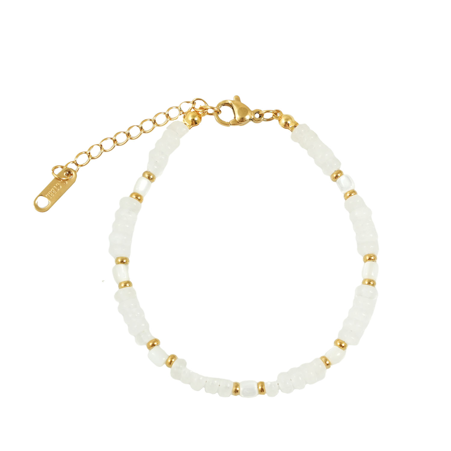 Βραχιόλι από χρυσή, ατσάλινη αλυσίδα με λευκές χάντρες διακοσμημένες κατά μήκος. Συνδυάζεται εύκολα με άλλα βραχιόλια και δεν προκαλεί αλλεργίες....