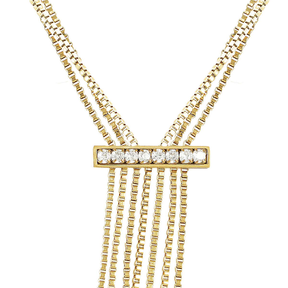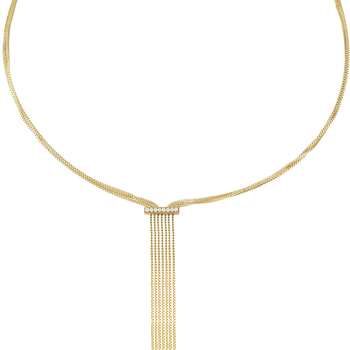 Ξεχωριστό, πρωτότυπο και εντυπωσιακό! Κολιέ – γραβάτα σε μακρύ μήκος, από χειρουργικό ανοξείδωτο ατσάλι, με ιδιαίτερο σχεδιασμό. Τρεις λεπτές, χρυσές αλυσίδες καταλήγουν σε μια πλακέτα με πέτρες, από την οποία έπειτα κρέμονται επτά χρυσές αλυσίδες.