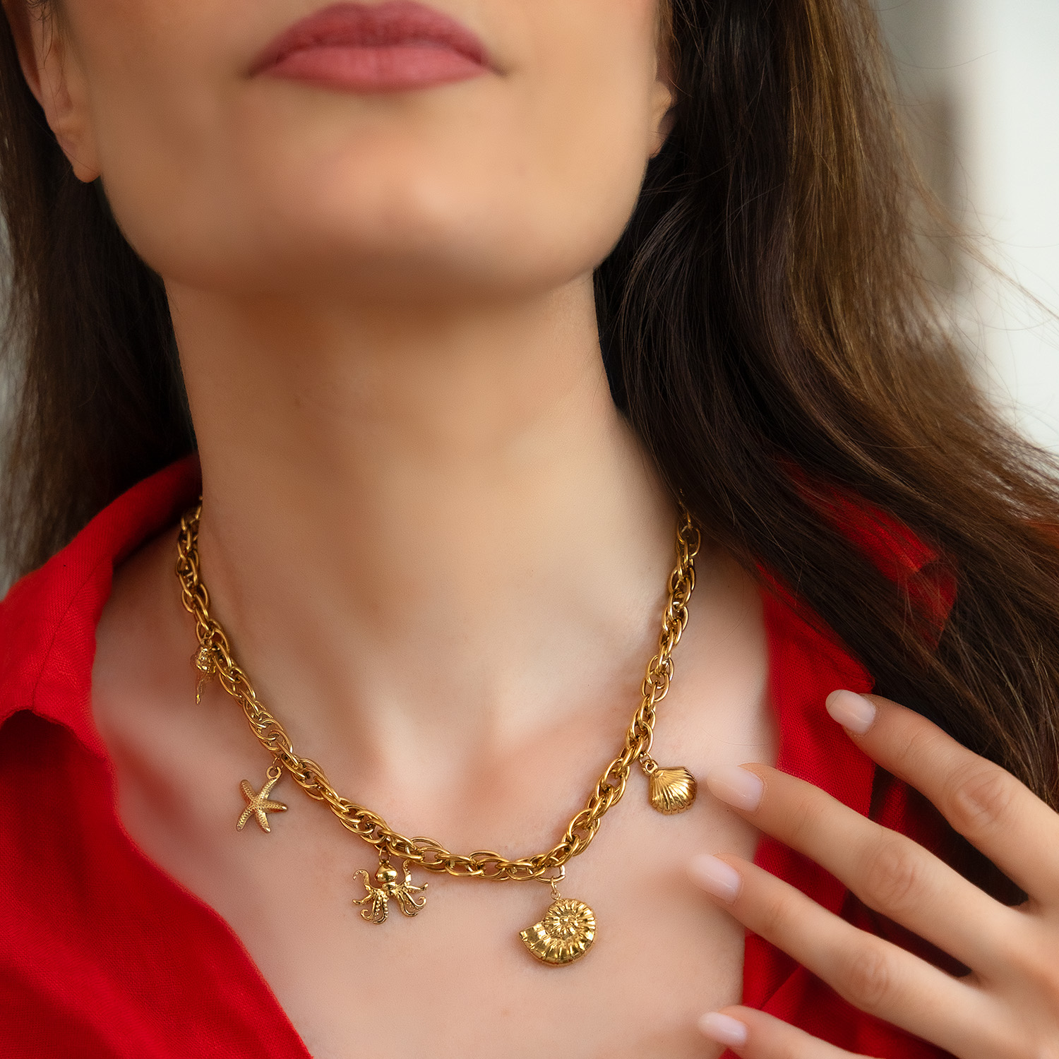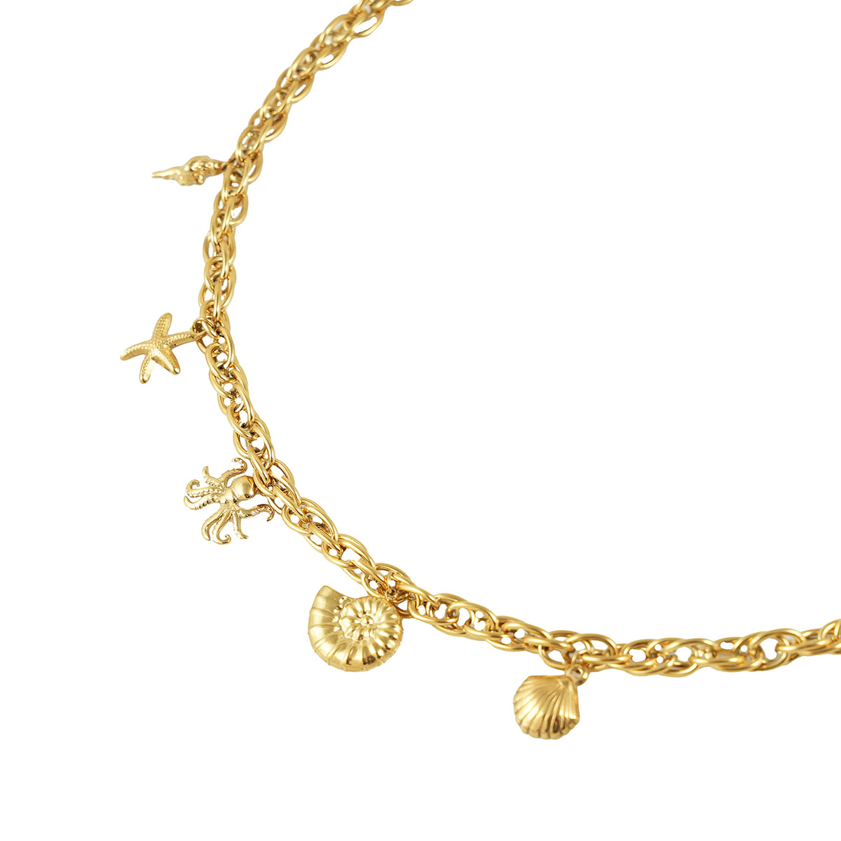 Χοντρή αλυσίδα από χειρουργικό, ανοξείδωτο ατσάλι, σε χρυσή απόχρωση. Τα παιχνιδιάρικα, κρεμαστά στοιχεία δημιουργούν την ιδανική, καλοκαιρινή επιλογή για καθημερινές εμφανίσεις. Το υλικό δε προκαλεί αλλεργίες και είναι ανθεκτικό στο νερό.