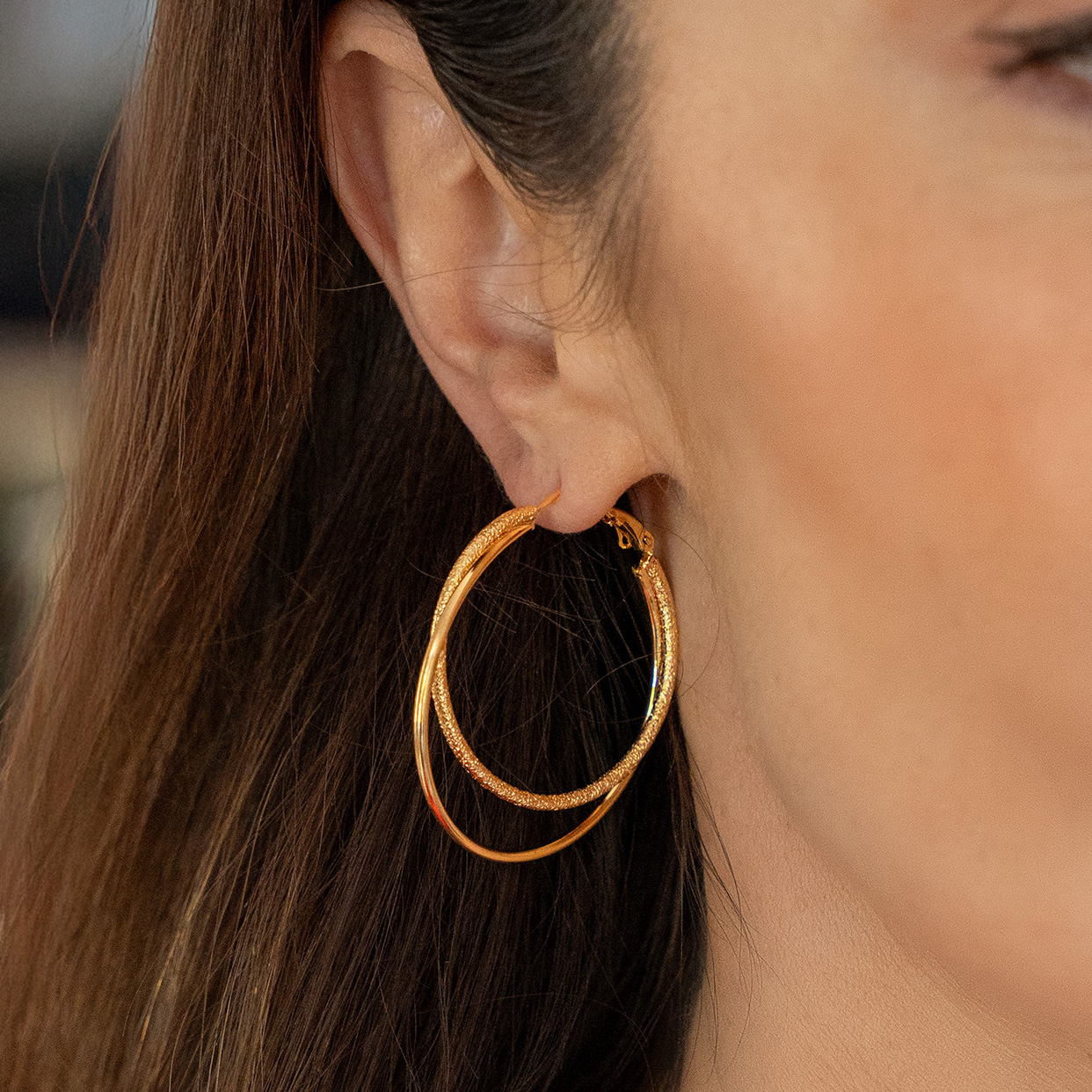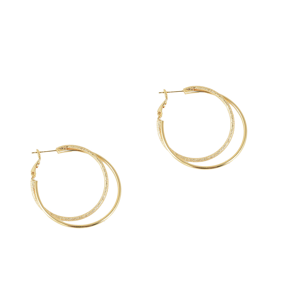 Mixed κρίκοι σε χρυσή απόχρωση, κατασκευασμένοι από ορεόχαλκο. Διπλός κρίκος που δημιουργεί μια μοντέρνα αντίθεση μεταξύ ματ χρυσής όψης και shiny glitter. Διαθέτουν κούμπωμα από ασήμι 925, ώστε να μη προκαλούνται αλλεργίες.