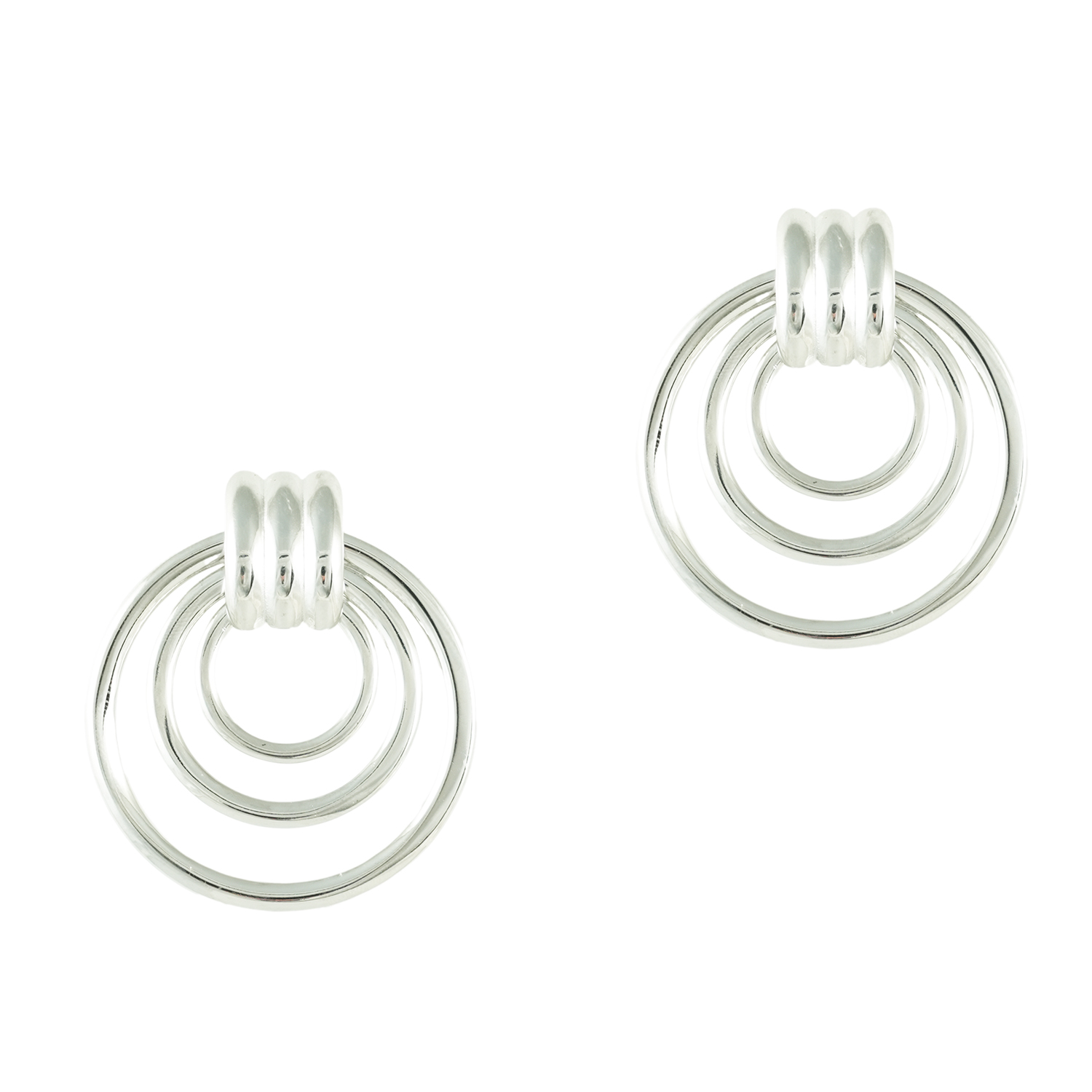 Σκουλαρίκια κρεμαστά ογκώδη, σε ασημένια απόχρωση, με τρεις εντυπωσιακούς κύκλους. Γεωμετρικό, μοντέρνο και ιδανικό για έντονα look! Το υλικό τους έιναι χειρουργικό, ανοξείδωτο ατσάλι το οποίο δε μαυρίζει και δε προκαλεί αλλεργίες.