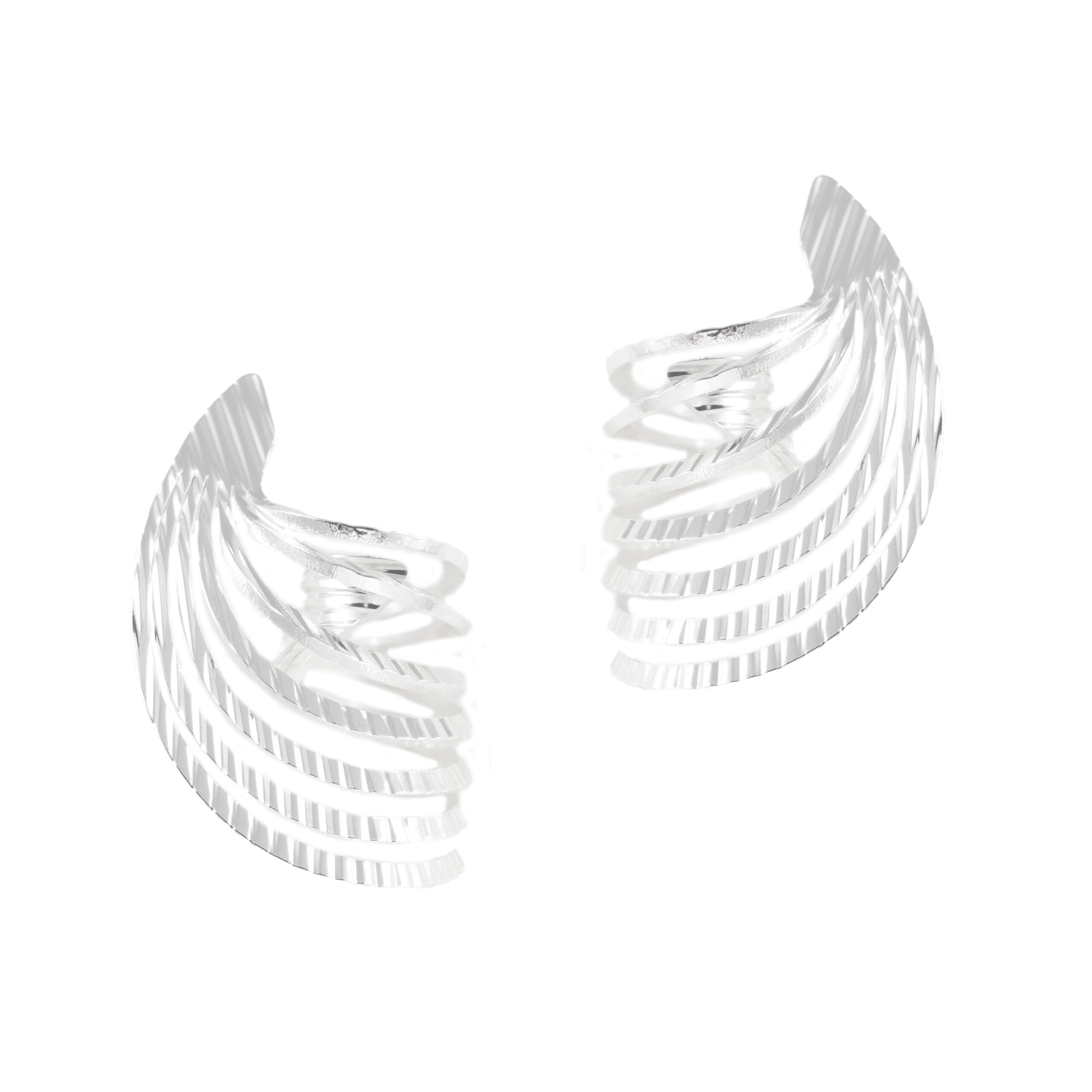 Σκουλαρίκια σε ασημί απόχρωση, κατασκευασμένα από ορείχαλκο με κούμπωμα από ασήμι 925. Ένα πολύ ιδιαίτερο ζευγάρι “γυριστά”σκουλαρίκια, με μοναδικό σχεδιασμό, ιδανικά για glam εμφανίσεις και όχι μόνο..