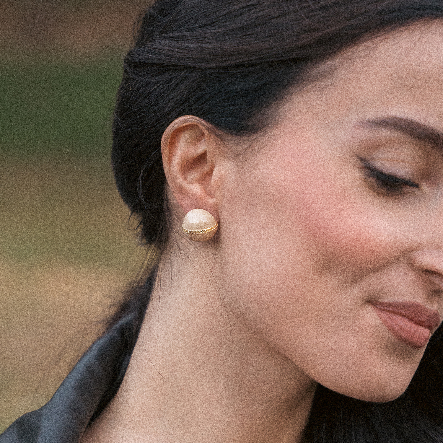 Μικρά, καρφωτά σκουλαρίκια σε σχήμα κουμπιού, σε μια παστέλ μπεζ απόχρωση που συνδυάζεται πολύ εύκολα. Η χρυσή κεντρική ρίγα του σχεδίου προσδίδει μια φωτεινή λεπτομέρεια που δημιουργεί αντίθεση. Είναι κατασκευασμένα από ορείχαλκο και διαθέτουν κούμπωμα από ασήμι 925.