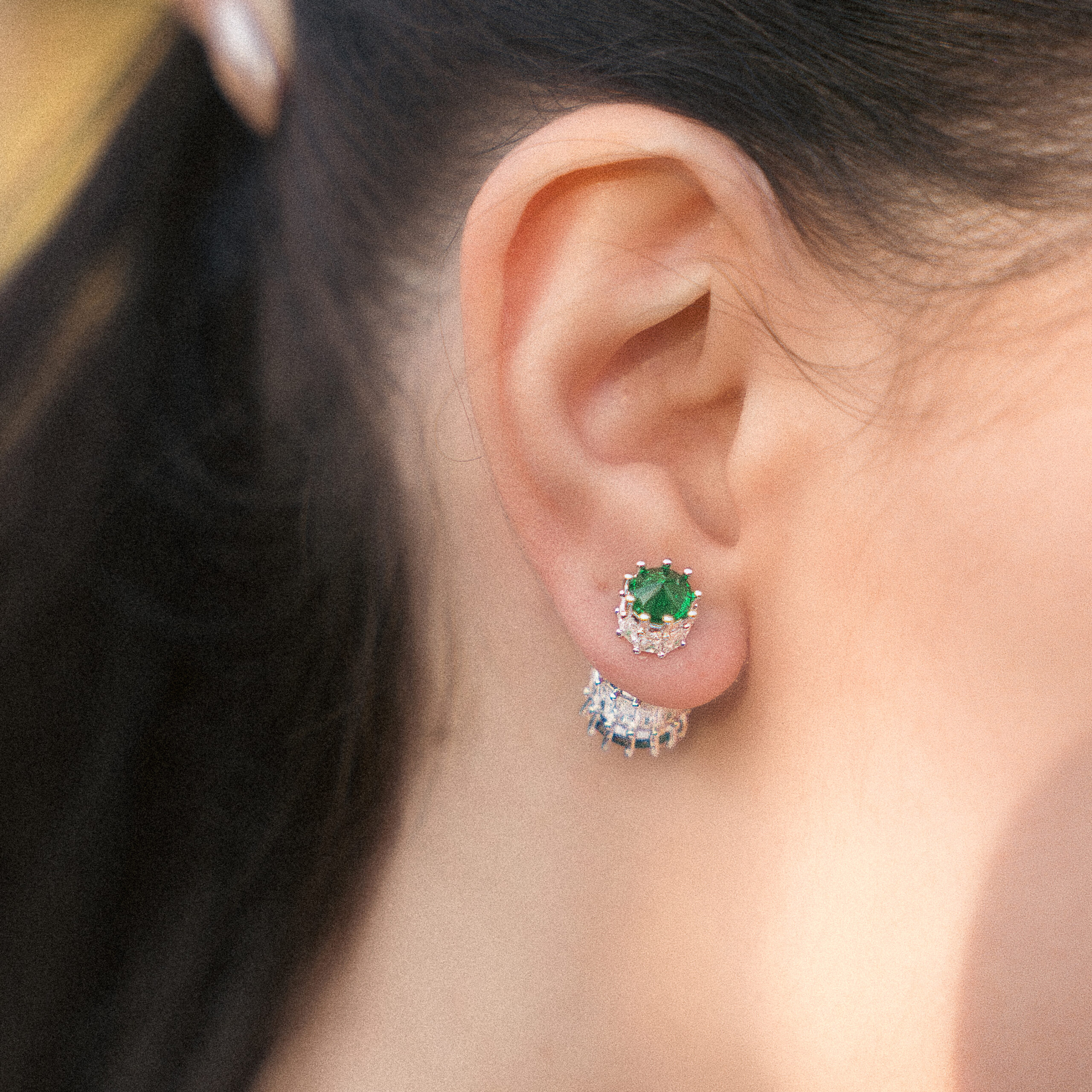Σκουλαρίκια καρφωτά σε ασημένια απόχρωση, με bar design διπλής όψης. Διακριτικά και λαμπερά με μια πράσινη πέτρα ζιργκόν σε κάθε πλευρά. Αγκαλιάζουν αρμονικά το αυτί, προσδίδοντας μια μοντέρνα νότα. Το υλικό τους είναι ορείχαλκος και διαθέτουν κούμπωμα από ασήμι 925.
