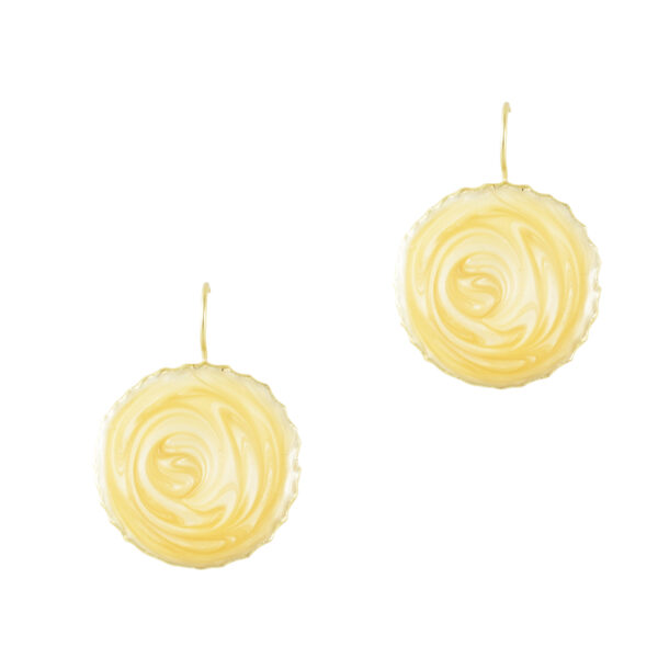 Σκουλαρίκια κρεμαστά, ελληνικής χειροποίητης κατασκευής από ορείχαλκο, σε χρυσή απόχρωση. Κύκλοι με σμάλτο σε εκρού χρωματισμούς που δημιουργούν κίτρινα “νερά”,...