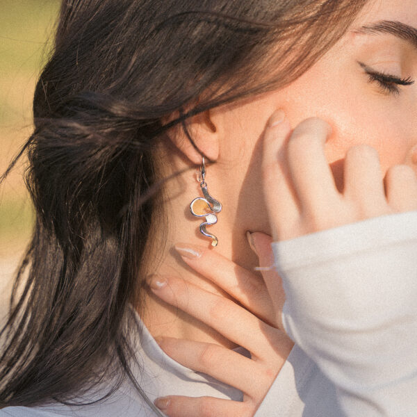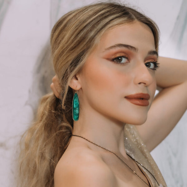 Σκουλαρίκια σε ασημί απόχρωση, ελαφρώς κρεμαστά, με ιταλική, χειροποίητη κατασκευή που εντυπωσιάζει. Κρεμαστά κυματιστά στοιχεία σε αποχρώσεις του σιέλ, γκρι...