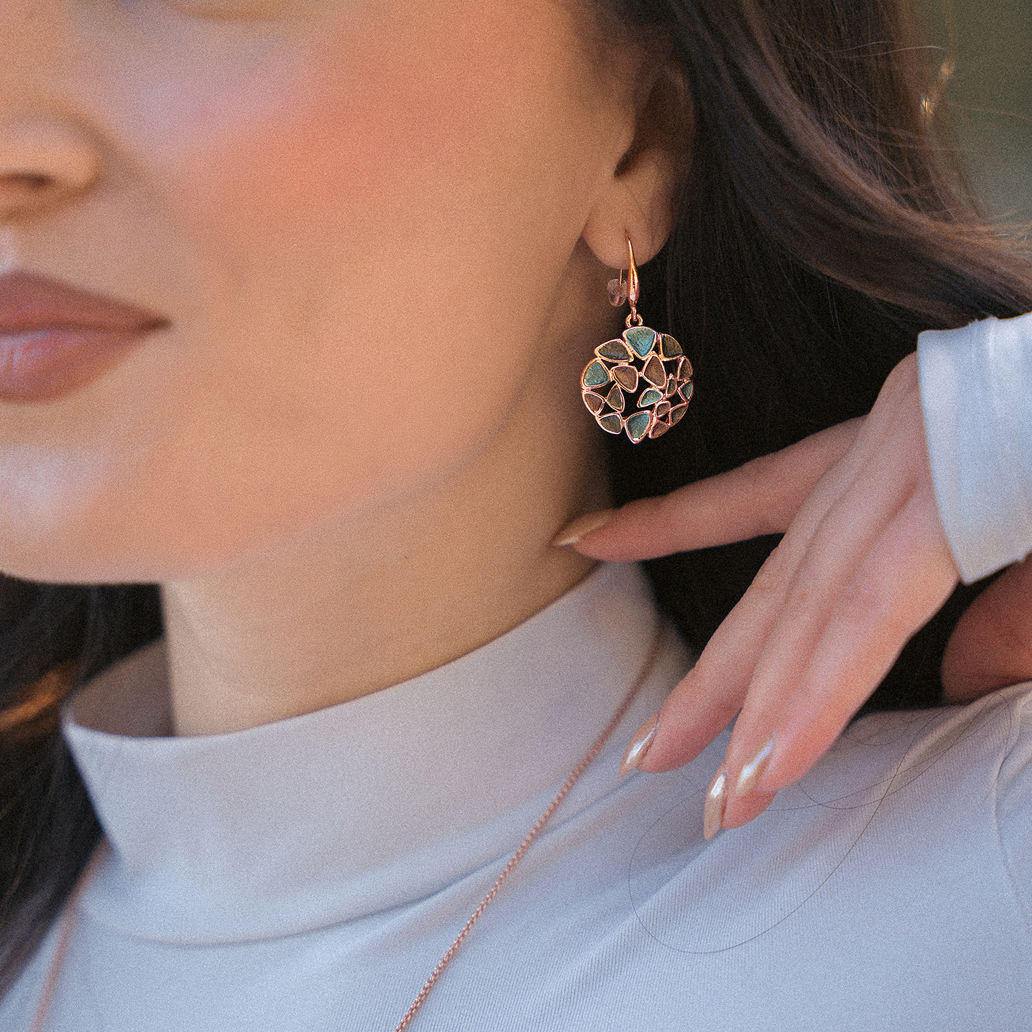 Χειροποίητα σκουλαρίκια, ιταλικής κατασκευής σε απαλό, φωτεινό ροζ χρυσό χρώμα. Ελαφρώς κρεμαστά, με κυκλικό μωσαϊκό μοτίβο χρωμάτων. Εντυπωσιακά, στο κατάλληλο μέγεθος ώστε να φορεθούν όλες τις ώρες!