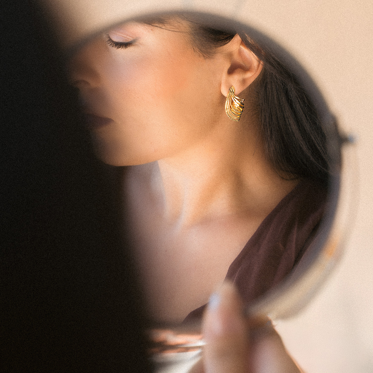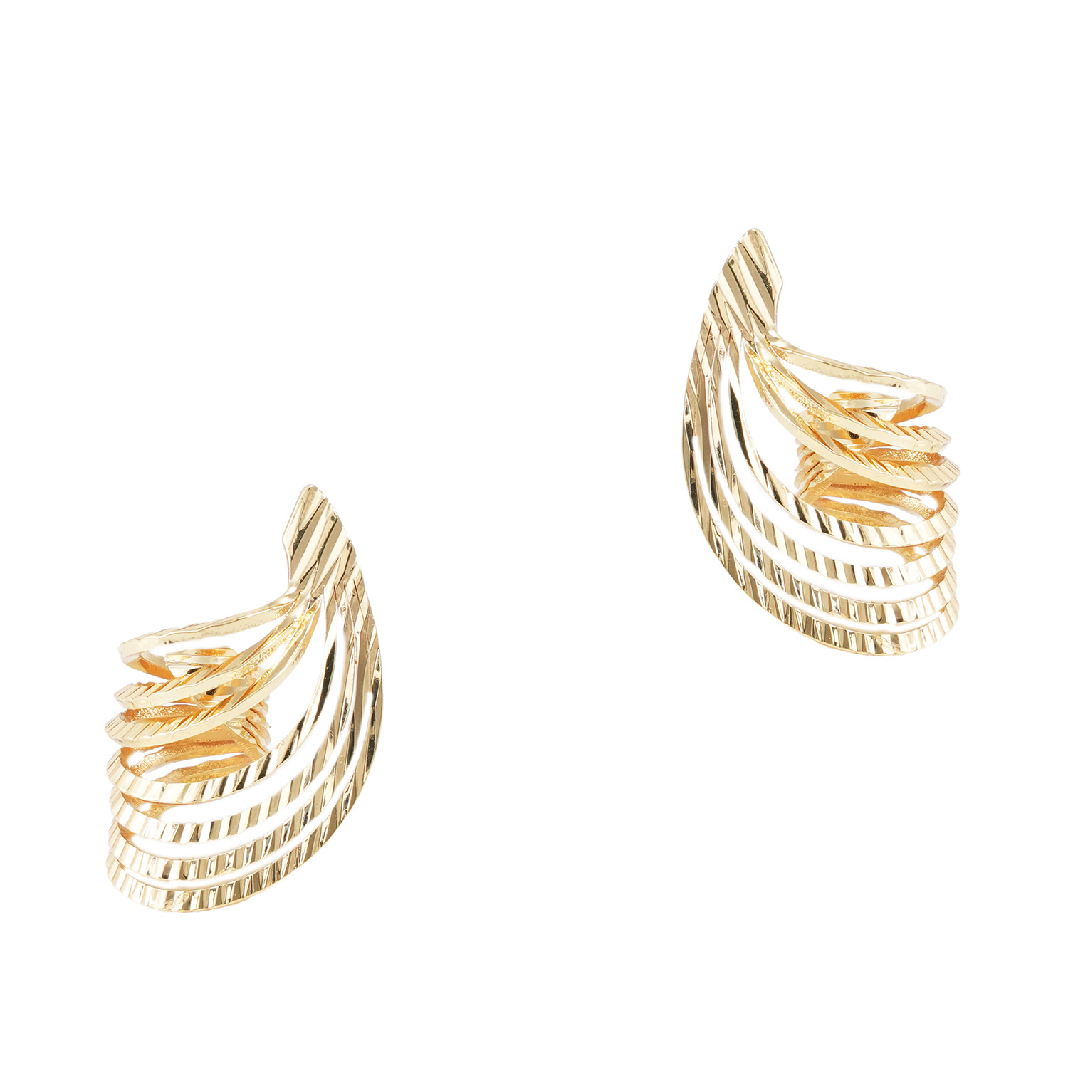 Σκουλαρίκια σε χρυσή απόχρωση, κατασκευασμένα από ορείχαλκο με κούμπωμα από ασήμι 925. Ένα πολύ ιδιαίτερο ζευγάρι “γυριστά”σκουλαρίκια, με μοναδικό σχεδιασμό, ιδανικά για glam εμφανίσεις και όχι μόνο..